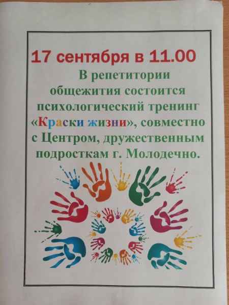 17.09.2024 состоялся психологический тренинг «Краски жизни», проведенный совместно с психологом Центра, дружественного подросткам г. Молодечно, Матусевич Жанной Геннадьевной. В ходе тренинга учащиеся размышляли о ценности человеческой жизни, формировали жизнеутверждающие позиции, развивали коммуникативные навыки. Ребята развивали способность воспринимать мир с любовью и радоваться жизни. Мероприятие завершилось совместным чаепитием.