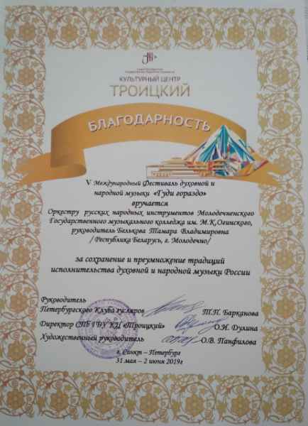 С 29 по 2 июня продолжался визит в Санкт-Петербург оркестра русских народных инструментов Молодечненского музыкального колледжа имени М.К.Огинского, который возглавляет талантливый опытный дирижер Тамара Владимировна Белькова. В этом году коллектив празднует 60 лет существования, а его руководитель – 40-летие творческой деятельности.