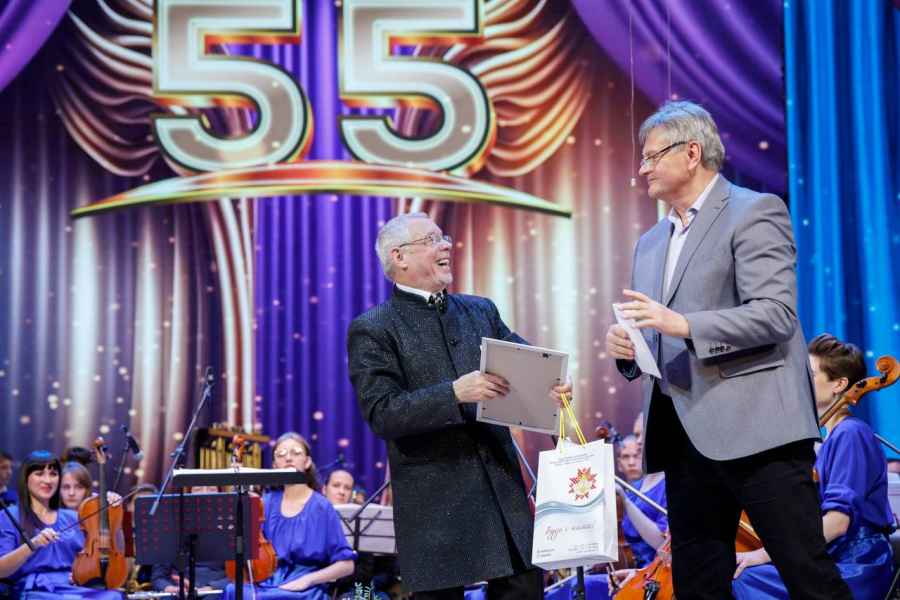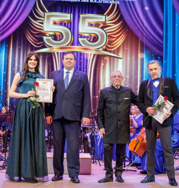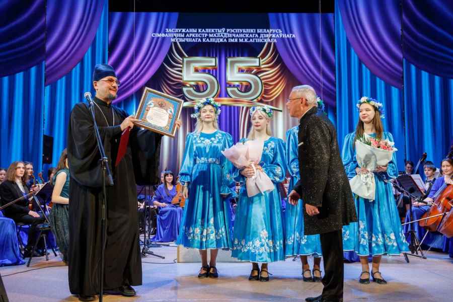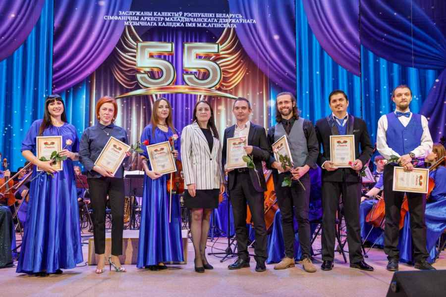 В связи с юбилеем коллектива были вручены высокие Благодарности и Грамоты, среди которых: Благодарственное письмо Молодечненского районного исполнительского комитета за высокий профессионализм, значительный вклад в формирование и развитие культуры Молодечненского района и в связи с 55-летием со дня образования; Грамота Патриаршего Экзарха в связи с 55-летием со дня основания в благословение за труды во славу Белорусской Православной Церкви; Почетная грамота Белорусского союза композиторов за значительный вклад в популяризацию белорусского национального музыкального искусства и в связи с 55-летием. Также было вручено множество именных грамот и благодарственных писем концертмейстерам оркестра. С поздравительным словом к оркестру и его руководителю обратился директор музыкального колледжа Рауба Дмитрий Александрович. Он отметил значимость оркестра для колледжа, города Молодечно, Минской области и Республики, высокий исполнительский уровень и преданность профессии.