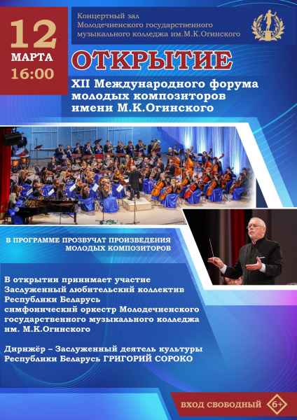 Молодечненский государственный музыкальный колледж им.М.К. Огинского гостеприимно принимает участников XІІ Международного форума молодых композиторов имени М.К.Огинского. 12 марта состоялось торжественное открытие и концерт заслуженного любительского коллектива Республики Беларусь симфонического оркестра Молодечненского государственного музыкального колледжа имени М.К.Огинского под управлением Григория Семёновича Сороко.