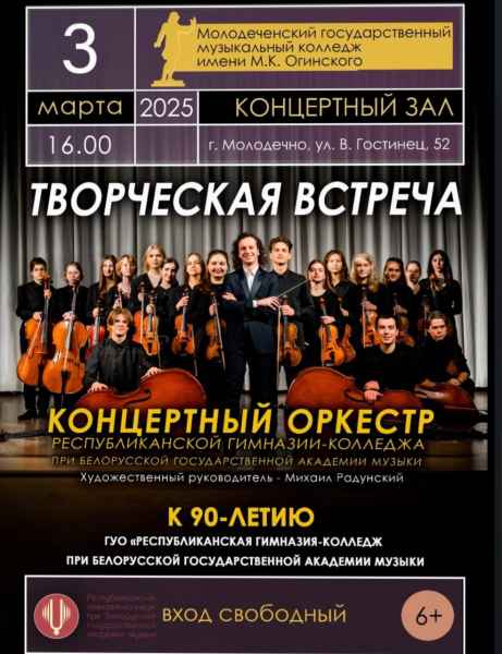 3 марта в концертном зале УО «Молодечненский государственный музыкальный колледж имени М.К.Огинского» состоялась творческая встреча с концертным оркестром Республиканской гимназии-колледжа при Белорусской государственной академии музыки (художественный руководитель Михаил Радунский). Благодарим талантливых и высокопрофессиональных исполнителей, замечательного руководителя и директора Республиканской гимназии-колледжа при Белорусской государственной академии музыки Коротину Наталию Аркадьевну за доставленное удовольствие, великолепную концертную программу и высокий исполнительский уровень! Браво артистам!!!