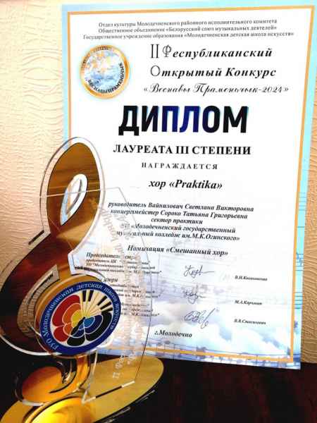 Хор старших классов "Praktika" дебютировал на II Республиканском открытом конкурсе "Веснавы Праменьчык - 2024", который проходил в ДШИ г. Молодечно. Выступление хора было отмечено дипломом лауреата III степени. Поздравляем хор и его руководителя Вайнилович Светлану Викторовну!