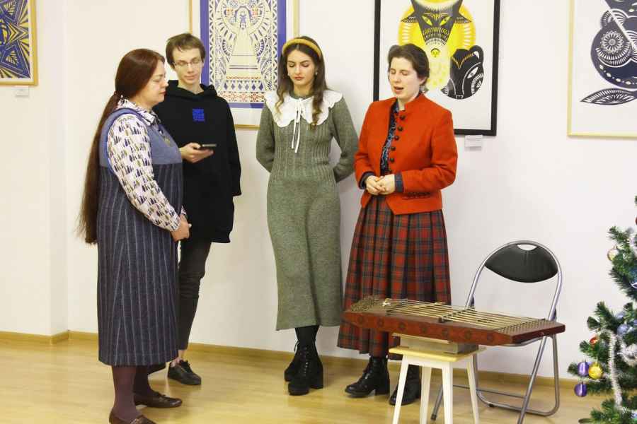 Святочную атмасферу дапамагала стварыць Кацярына Гіль, граючы аўтэнтычныя танцавальныя мелодыі на цымбалах. Таксама ў аўтэнтычнай манеры прагучалі старажытныя песні, якія выканалі выкладчыца нашага каледжа Лізавета Лобан, Кацярына Гіль, а дапамагалі Наталля Чырвонцава і Канстанцыя Герасіменка.