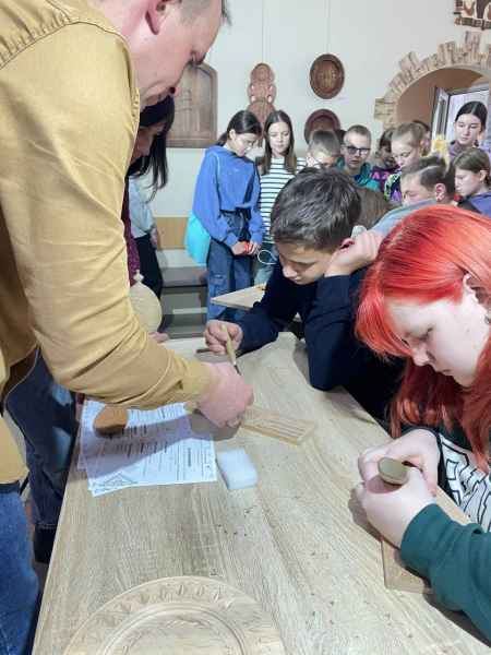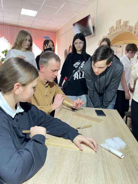 Было вельмі прыемна назіраць за тым, з якой цікавасцю вучні школы разглядалі інструменты для разьбы, як старанна спрабавалі паўтарыць тэхніку разьбы, параўноўвалі выразкі свае і навучэнцаў каледжа.