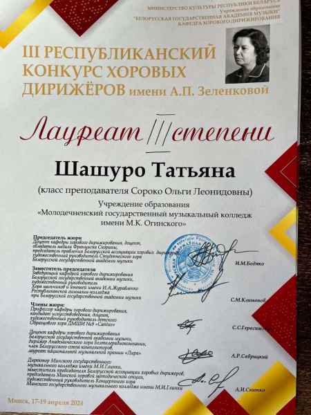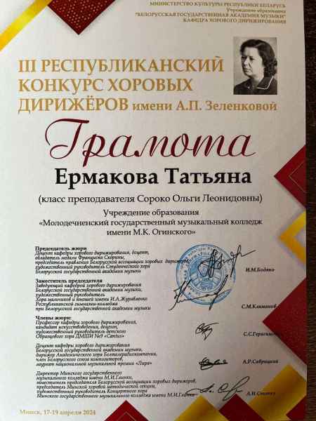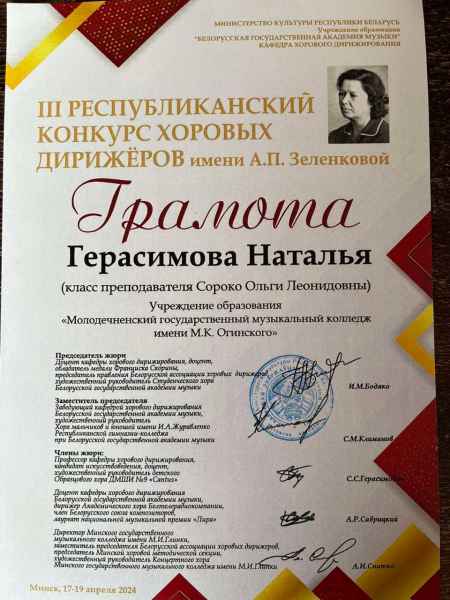 С 17.04.2024 по 19.04.2024 в УО «Белорусская государственная академия музыки» прошел IІI РЕСПУБЛИКАНСКИЙ КОНКУРС ХОРОВЫХ ДИРИЖЁРОВ ИМЕНИ А.П.ЗЕЛЕНКОВОЙ.