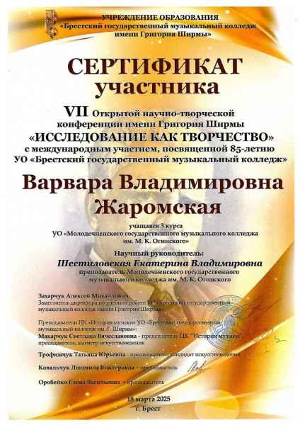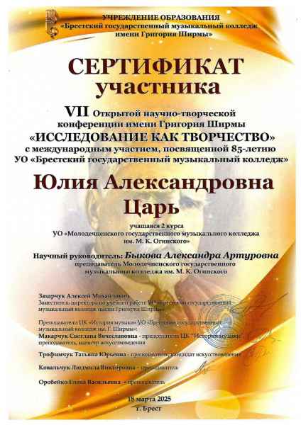 18 марта 2025 года на базе УО "Брестский государственный музыкальный колледж им.Г.Ширмы" состоялась VII Открытая научно-творческая конференция имени Григория Ширмы «Исследование как творчество», приуроченная к 85-летию учебного заведения. В конференции приняли участие учащиеся-музыковеды, представившие Лидский, Брестский, Могилевский музыкальный колледжи, а также Республиканскую гимназию-колледж при БГАМ, Пензенский музыкальный колледж им. А.Архангельского. Представителями нашего колледжа стали учащаяся 3 курса отделения "Музыковедение" Жаромская Варвара (научный руководитель Шестиловская Е.В.) и учащаяся 2 курса отделения "Музыковедение" Царь Юлия (научный руководитель Быкова А.А.). В своих докладах юные исследователи обратились к изучению белорусской музыкальной культуры, творчества таких белорусских композиторов, как М.К. Ельский и Г.К. Горелова.