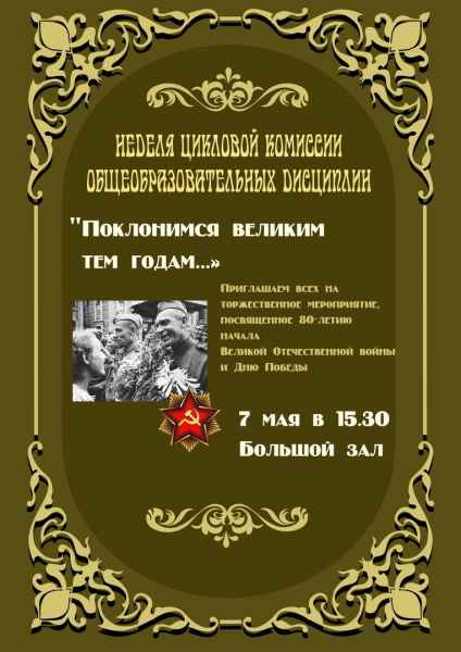 7 мая в рамках Недели цикловой комиссии общеобразовательных дисциплин прошло мероприятие, посвящённое 80-летию начала Великой Отечественной войны и Дню Победы «Поклонимся великим тем годам…», подготовленное преподавателями Шалесной А.Ф., Дедюль А.В. и Русак И.А.